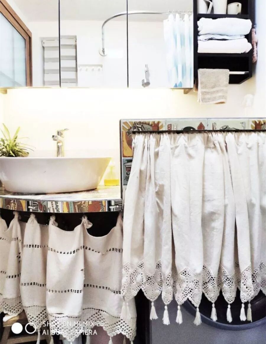 神仙屋主 @胡小仙儿 用自制布帘遮住了洗手盆下的乱七八糟。还可以当擦手巾来用哦哈哈哈~