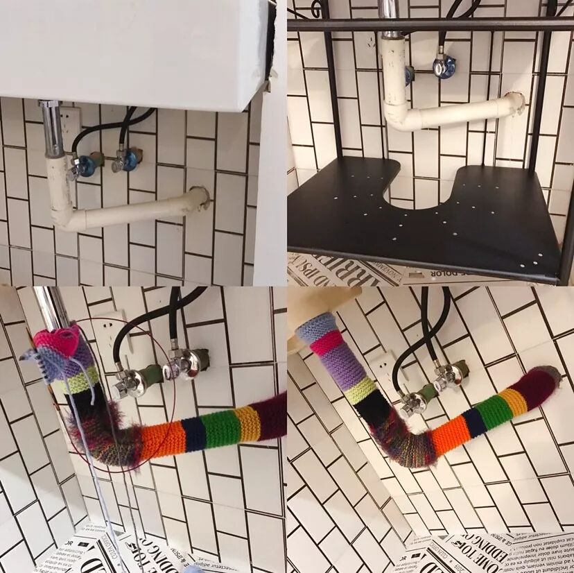 编织狂人@老万不爱争 就更更厉害了, 竟然给水管织了件彩色毛衣!可以,这届屋主很优秀!