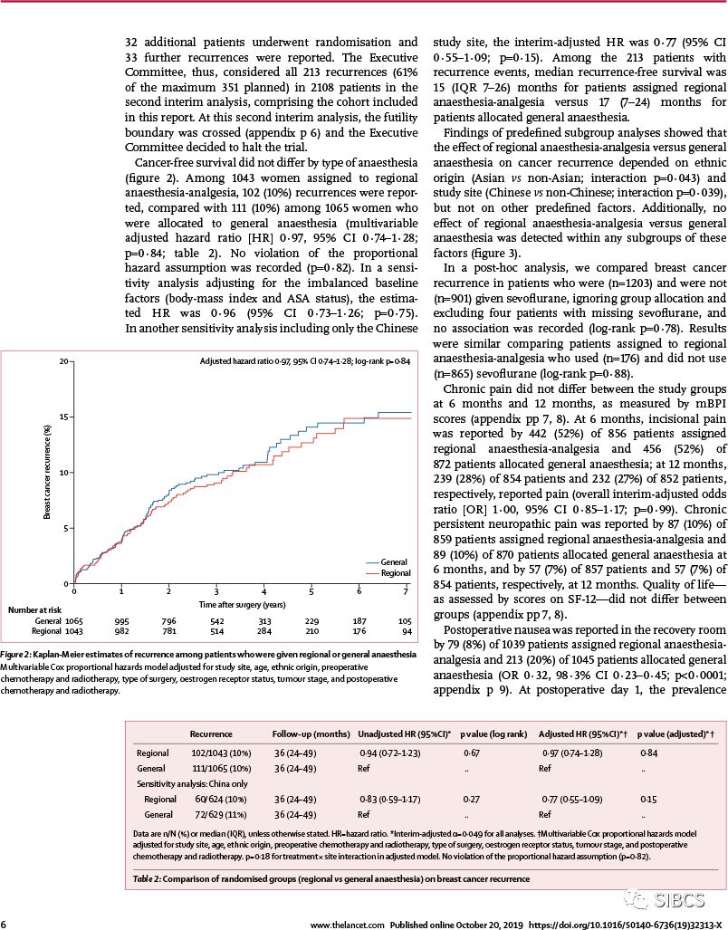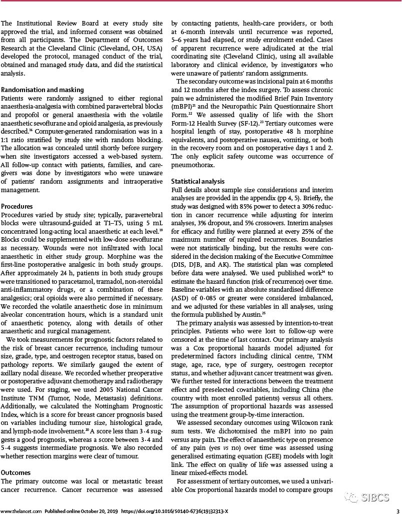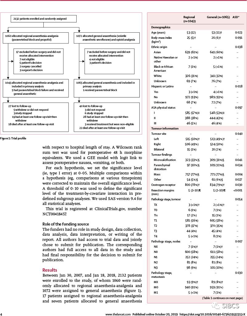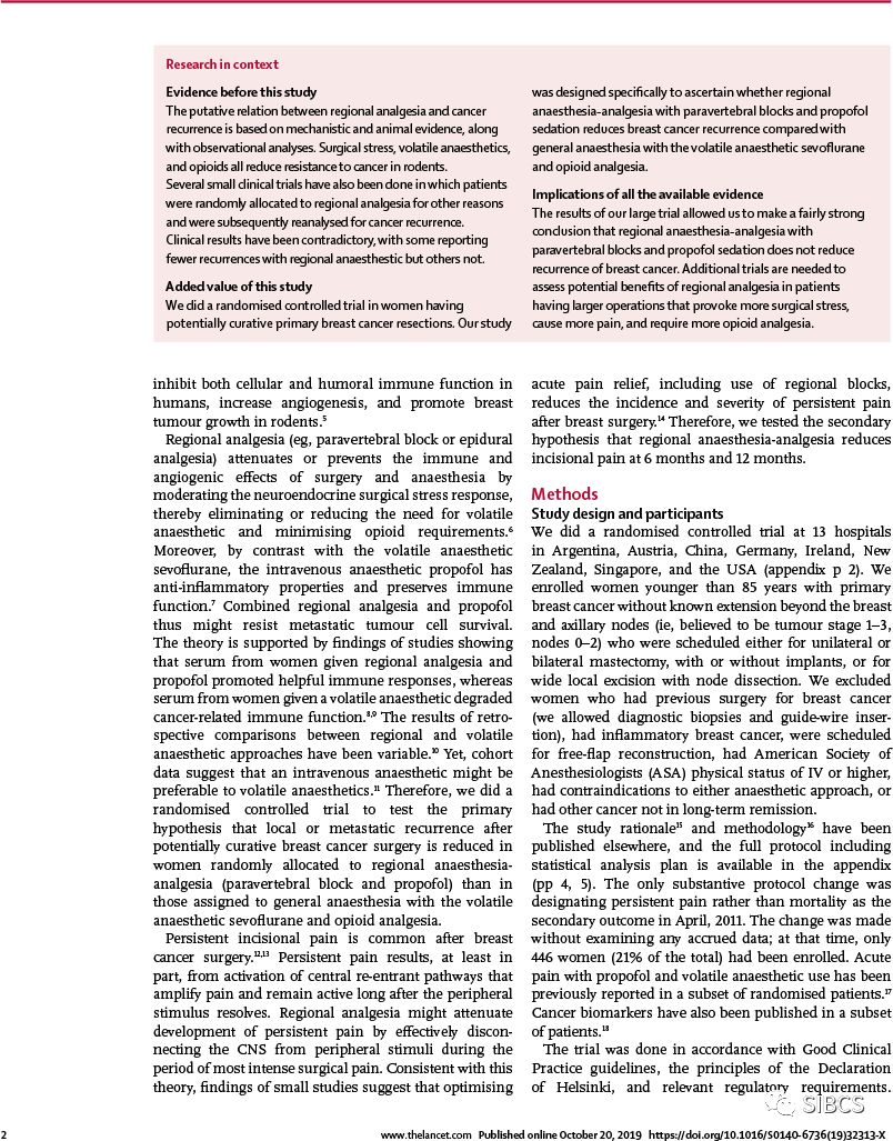 该国际多中心随机对照研究于2007年1月30日~2018年1月18日从阿根廷、奥地利、中国、德国、爱尔兰、新西兰、新加坡、美国的13家医院,入组年龄<85岁的原发乳腺癌根治切除女性,通过计算机随机分组,接受区域麻醉镇痛(椎旁阻滞和丙泊酚)或者全身麻醉(七氟醚)和阿片类药物镇痛。主要结局为乳腺癌局部或远处转移复发,次要结局为6个月和12个月时的切口疼痛。初步分析按照意向治疗原则进行。超过预设无效临界值后,该研究停止。