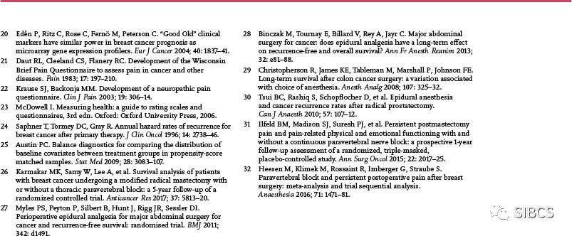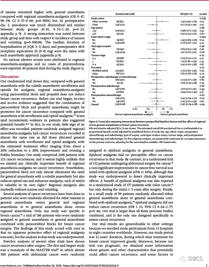 因此,该研究结果表明,对于该乳腺癌手术人群,区域麻醉镇痛(椎旁阻滞和丙泊酚)与挥发性麻醉药(七氟烷)和阿片类药物相比,根治手术后乳腺癌复发并未减少,乳房切口持续疼痛比例和严重程度相似。临床医师既可以选择区域麻醉镇痛,也可以选择全身麻醉镇痛,并不影响乳腺癌复发和切口持续疼痛。