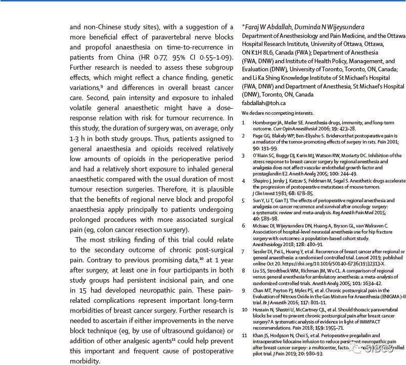 对此,加拿大渥太华大学、多伦多大学和圣米迦勒医院发表同期评论:麻醉干预与长期肿瘤复发。