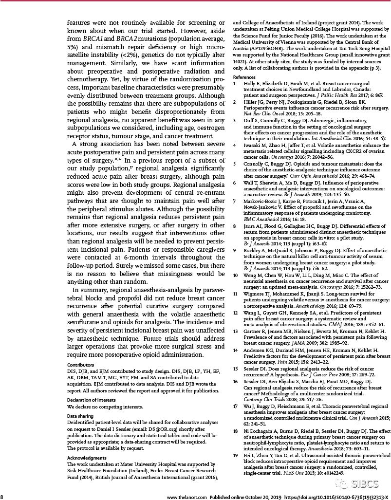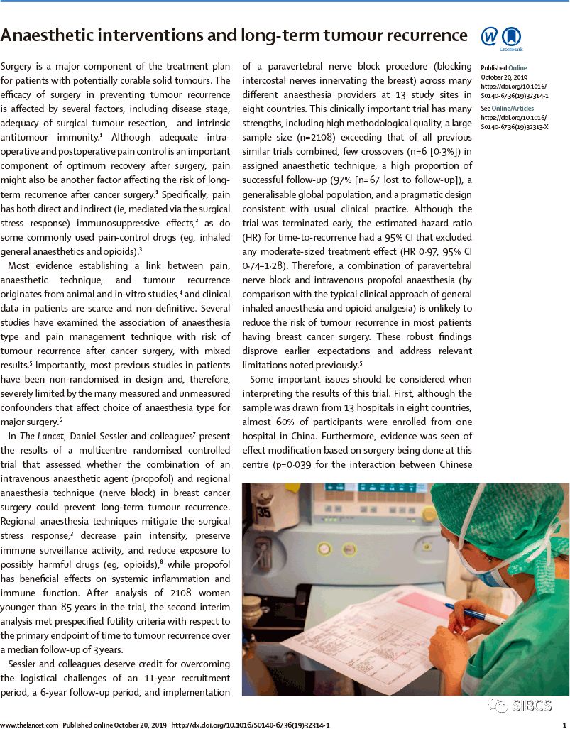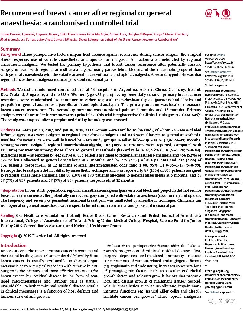 2019年10月20日,国际四大医学期刊之一、英国《柳叶刀》正刊在线发表美国克利夫兰医学中心、中国医学科学院北京协和医院、奥地利维也纳医科大学、德国杜塞尔多夫大学、新加坡南洋理工大学陈笃生医院、爱尔兰都柏林大学的随机对照研究报告,对乳腺癌区域或全身麻醉手术后的长期复发和切口疼痛进行了比较。