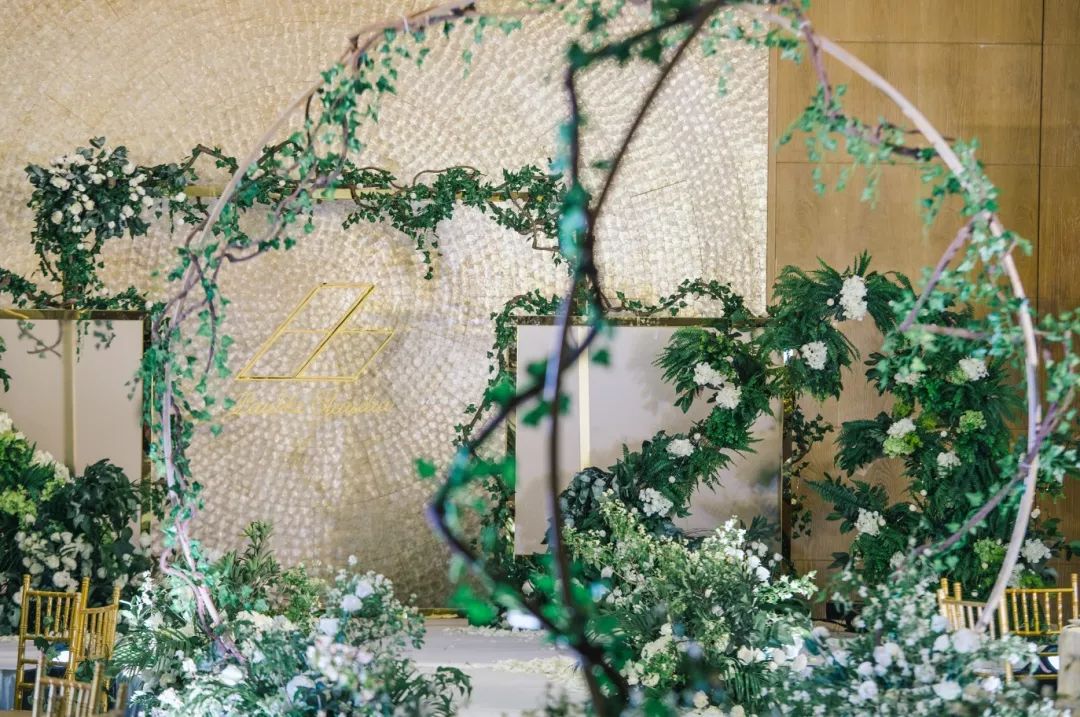 新娘爱草木,新郎爱小动物,所以婚礼仪式的主背景设计结合了他们的喜好,而灵感来自他们的宠物兔子和鹦鹉的剪影。