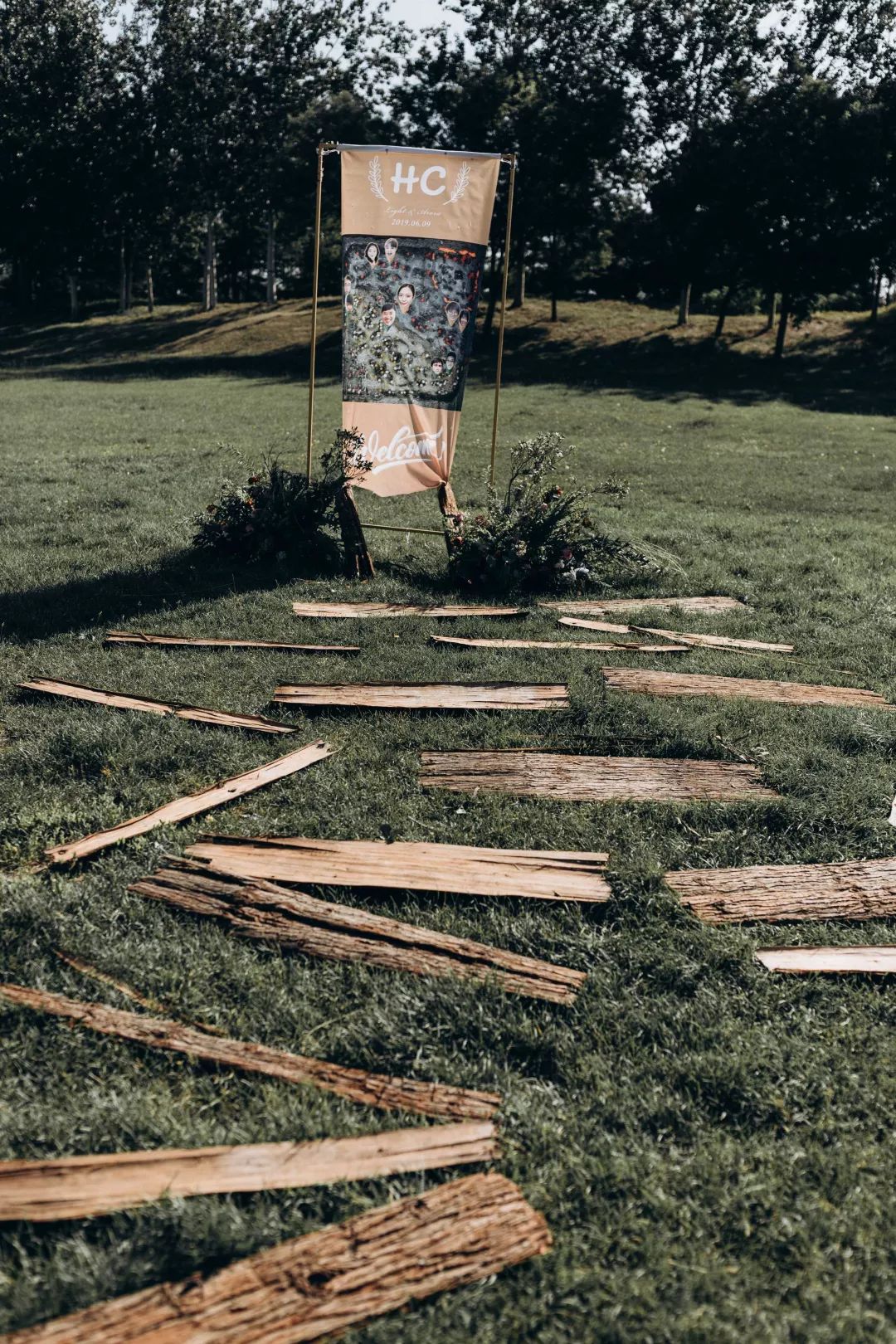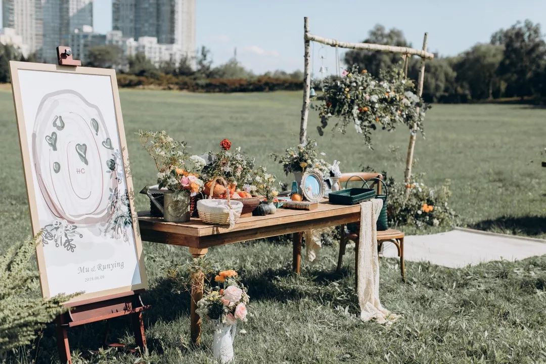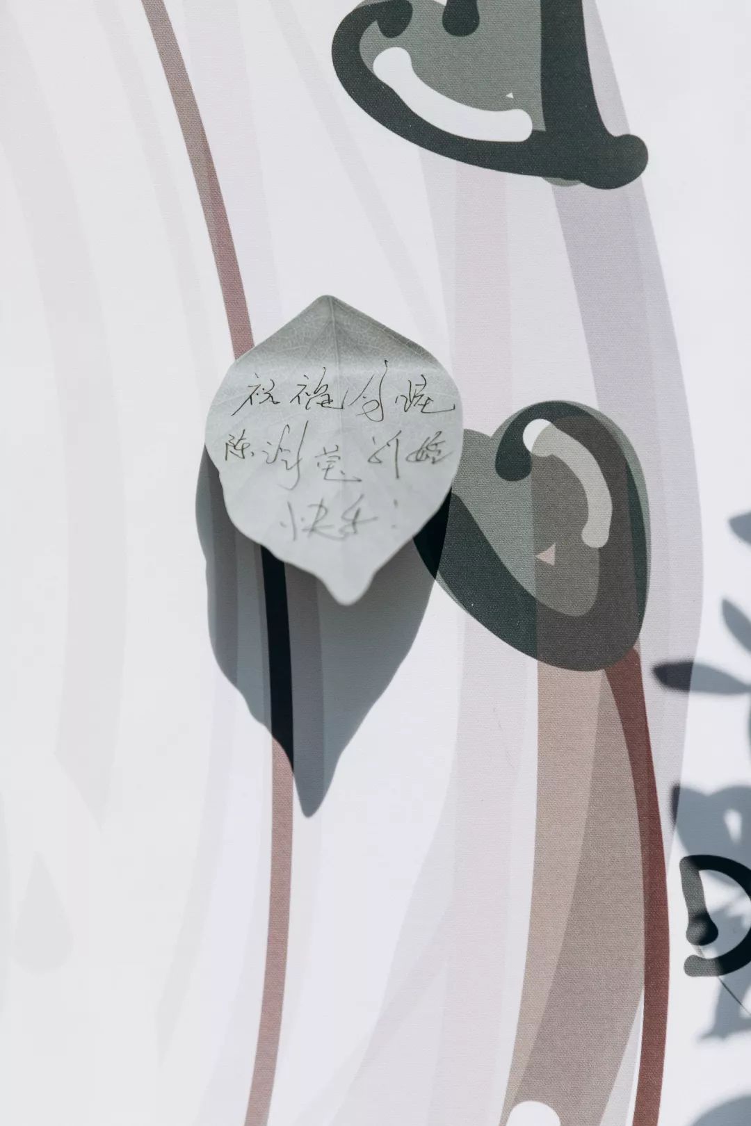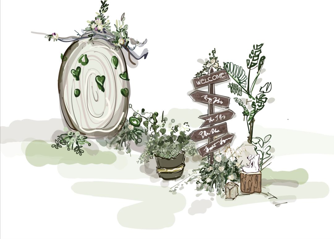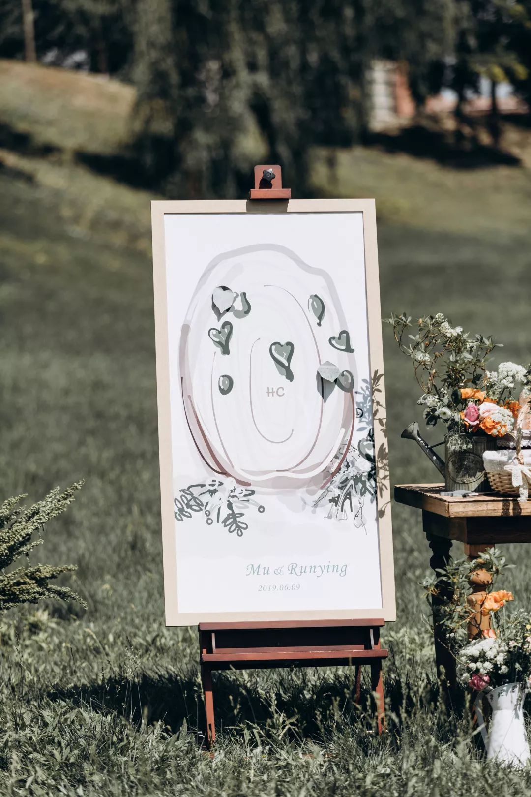 签到区域是给新人手绘的一幅签到画,宾客在叶子形状的纸笺上写上祝福语,贴在年轮的画上,也寓意着新人的成长、幸福与家人、朋友亲密相连。