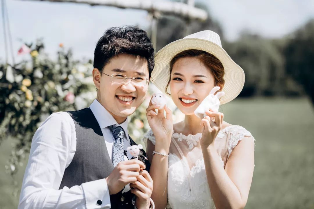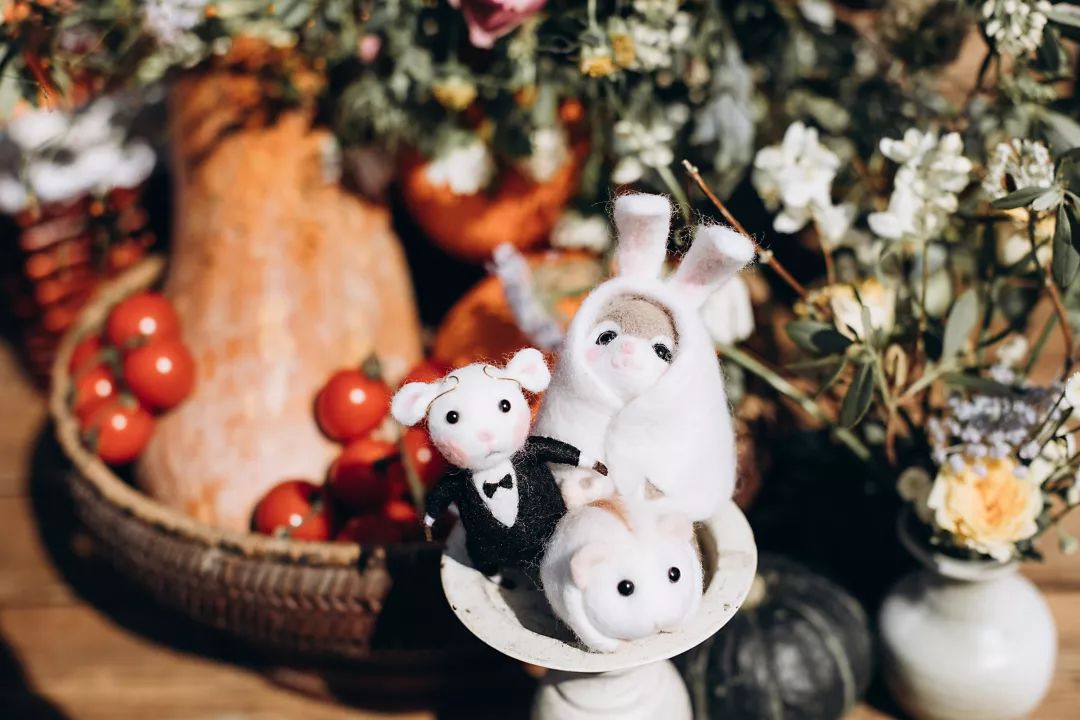 这场婚礼的新娘被称作“香兔”,新郎被叫做“臭猴”,所以现场就有了穿礼服的兔子和猴子的布置,这对超爱小动物的新人看到这样的设计,也是超喜欢的。