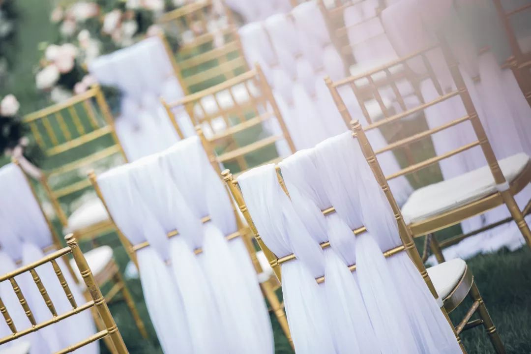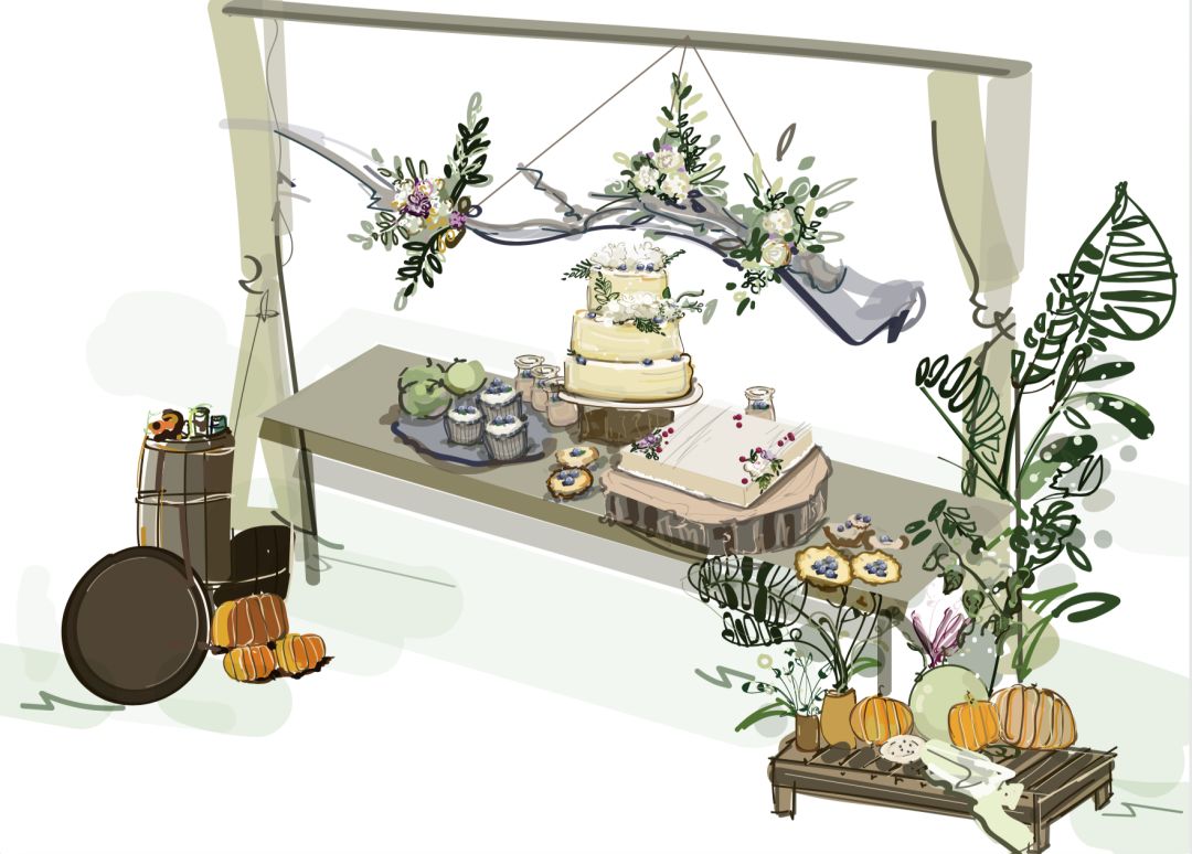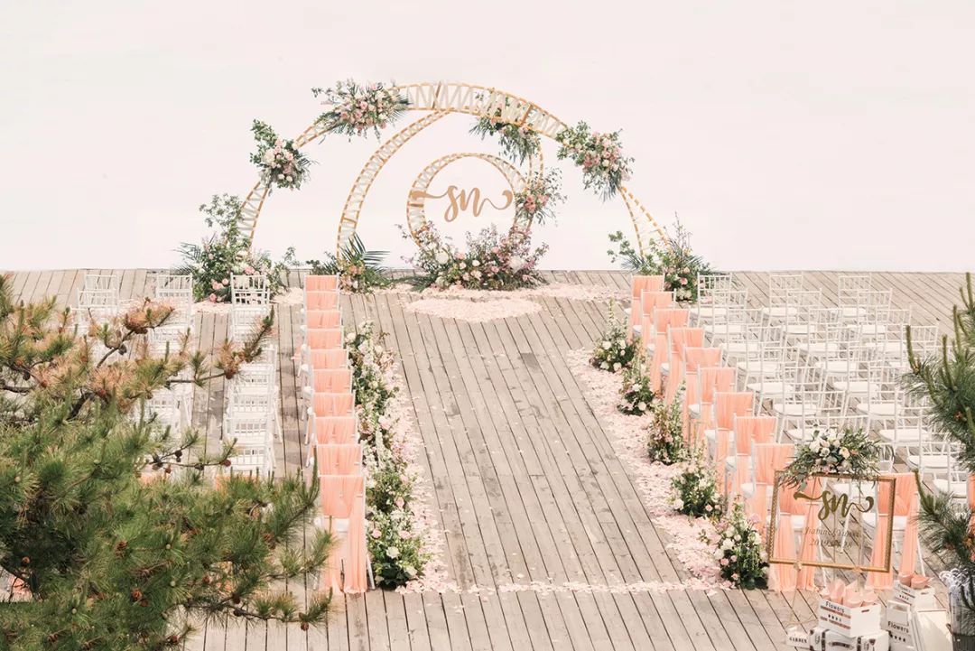 完全推翻了之前的想法,配色由之前新娘喜欢的灰粉色调改为香槟色,代表阳光。婚礼的风格是纯粹、简洁。