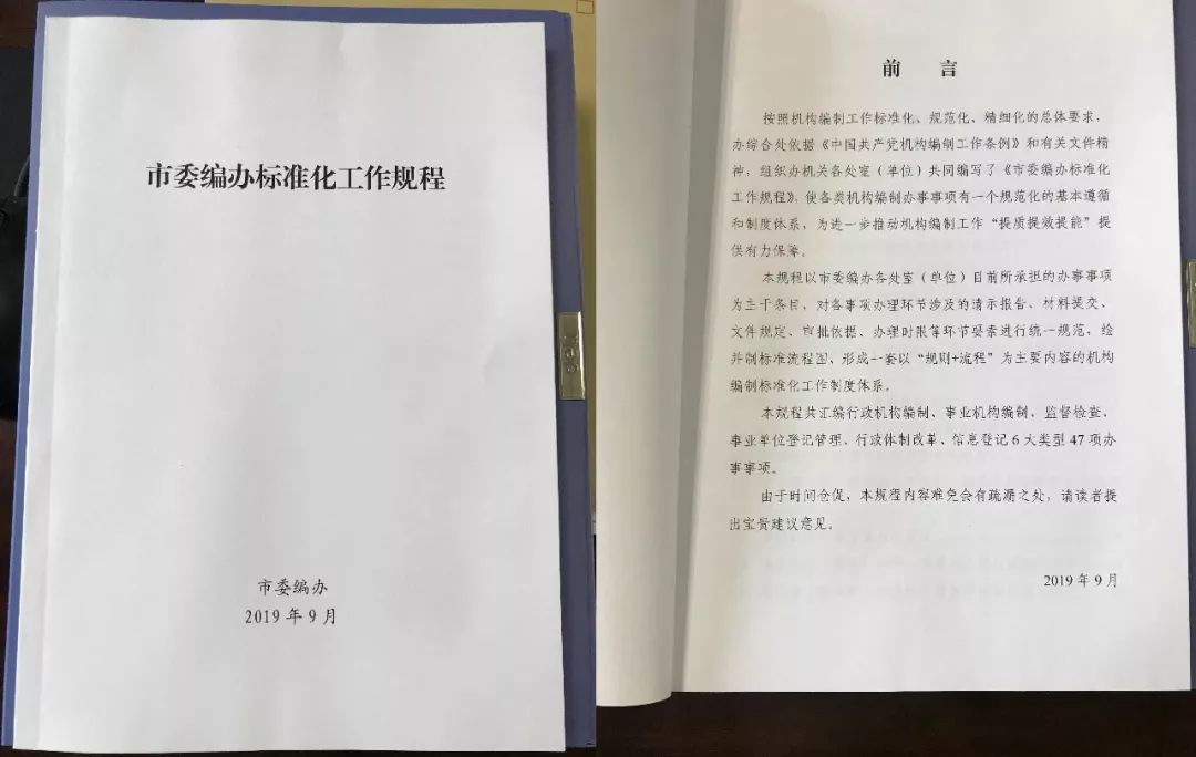 市委编办自开展“不忘初心、牢记使命”主题教育以来,着力破解机构编制审批事项类型众多、规定不明、流程不清的弊病,以《中国共产党机构编制条例》和市委编委工作规则为基本遵循,编撰形成《市委编办规范化工作规程》。规程不但对事项办理进行规范和约束,增强了新时代机构编制审批事项的科学性和规范性,还为机构编制干部队伍学习掌握、交流切磋各项业务知识提供了指导。