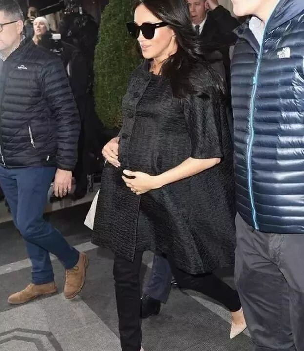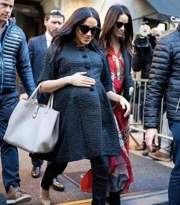 这天,梅根穿的非常漂亮,她选择了一身很宽大的黑色短袖孕妇装,这件孕妇装看起来非常的高端,上面都是褶皱的黑色花纹,衣领和纽扣看起来也比较复古。