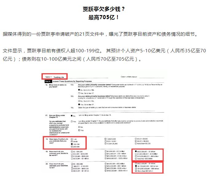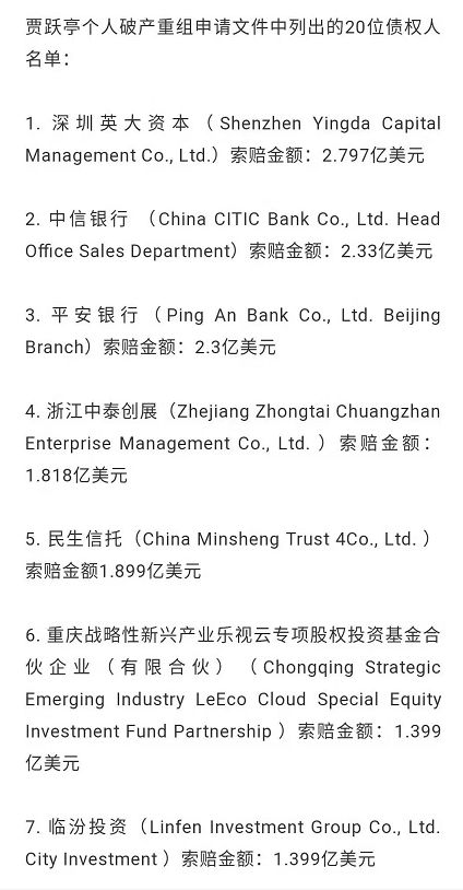 媒体披露贾跃亭在美国申请破产的21页文件中,共涉及债权人超过100位,这还没算上乐视上市公司的20多万股民。。也就是说严格计算贾跃亭的债权人已经超过了20万人。。。其中仅仅前20名的债权人,索赔金额合计就高达24.91亿美元(约人民币176亿元)!
