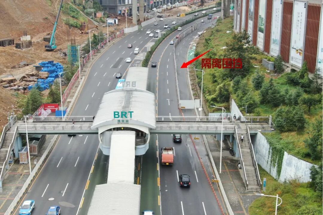 施工隔离区域从BRT渔安站开始,一直延伸至渔安立交上北京东路的匝道上,施工长度约300米,施工路段最窄处只有两车道可以通行。