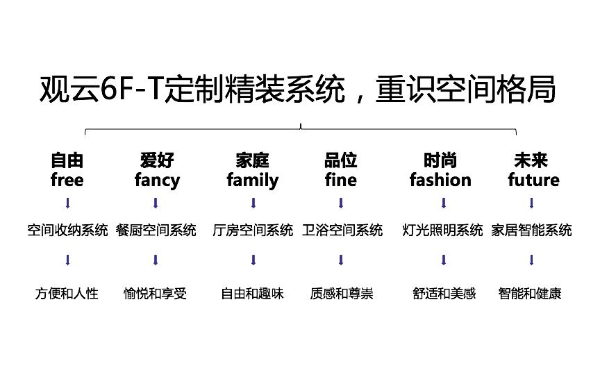 观云以超前设计语言和创新精神,契合贵阳本土特性提出了 6F-T 定制精装系统,分别代表着“自由、爱好、家庭、品味、时尚与未来”。为了更大程度向居者呈现“有审美的舒适,有设计的生活”,观云通过大量匠心细节突出这一印象。