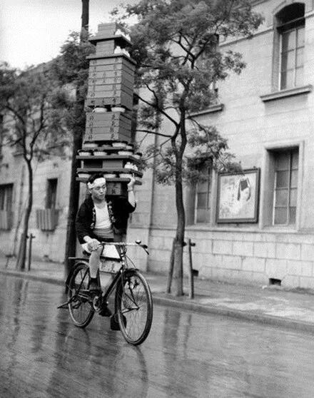 看看上面这餐盒,叠起来比人还高了吧?直接扛在肩上还能骑车,这操作也太秀了。但现代科技在进步,随着昭和时代的发展,骑自行车的人最终演变成了骑摩托车的人,但这些送餐员仍然使用和以前一样的方式运送货物(尽管骑摩托车送不了那么多,但他们依然还是扛在肩上)。