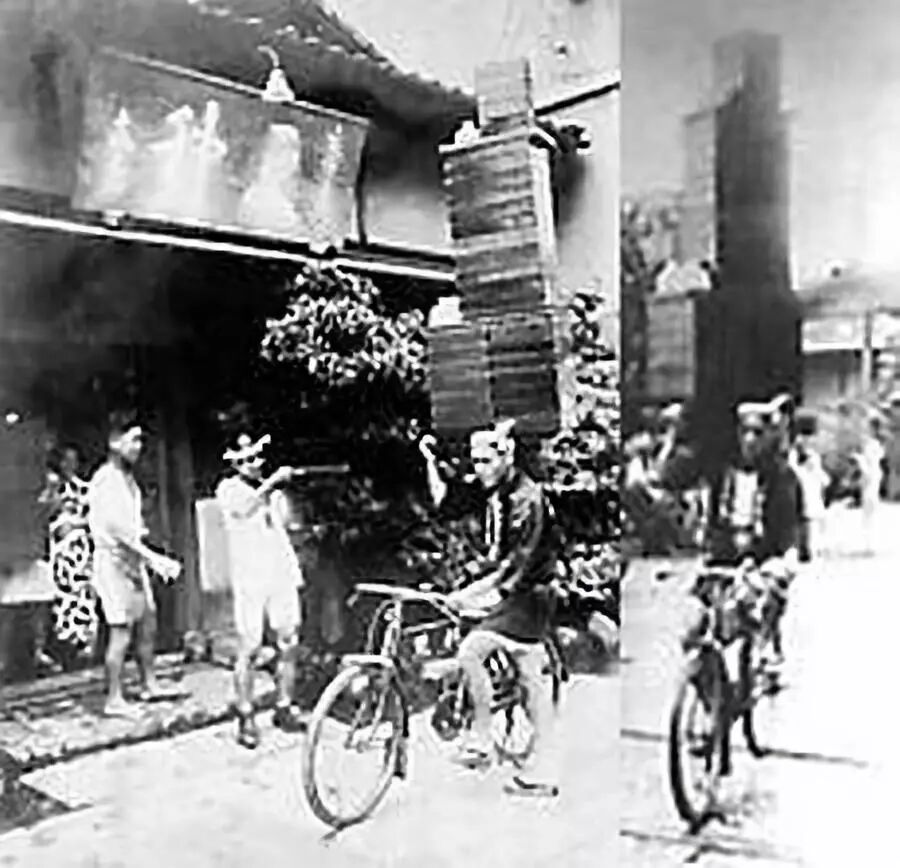 一位日本网友在推文中展示了许多旧时代荞麦面送餐员骑着自行车的照片,每一张照片都展示了令人瞠目的技巧和灵巧程度,这些日本送餐小哥将一盘盘的荞麦套餐扛在肩上并保持着平衡。这技术估计不练个一两年还是不敢上路的吧?