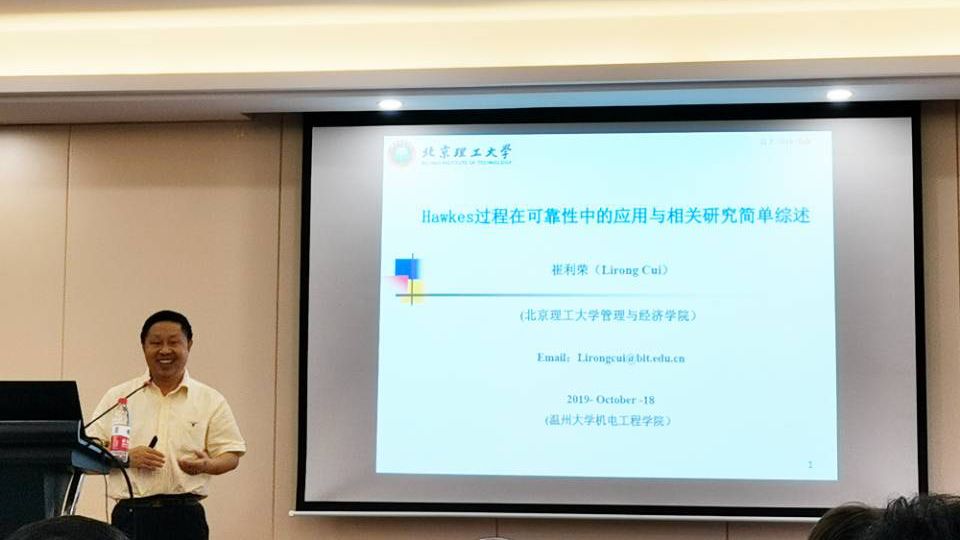 10月18日上午,国家自然基金管理科学专业评审组专家、北京理工大学管理与经济学院崔利荣教授在学院6B309学术报告厅为学院师生做了一场题为“Hawkes过程在可靠性中的应用与相关研究简单综述”的学术讲座。本次讲座由机电工程学院院长周宏明主持。