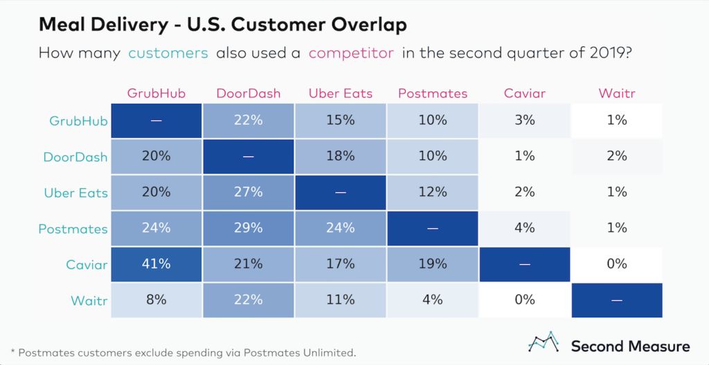 目前来看,大城市已大都被瓜分完毕,美国外卖市场的战争正转移至下沉市场,这一趋势和国内相似。一方面在这个市场,披萨和中餐仍然是唯一的外卖选择;另一方面,这些地方成本更低。 在国内美团和饿了么打得不可开交的时候,美国外卖巨头也开始发起价格战,大家先后开始转向订阅模式。 2016年,Postmates率先推出会员制度(每月9.99美元),一旦购买,就可以免去订餐的送货费用,目前已有16%的用户成为了会员。这项业务已经成为公司利润稳定增长的原因之一。 DoorDash在2018年也推出订阅模式服务(每月9.99美元),只要每单订单在15美元以上,就可以享受不限次数的免费送餐服务。不到一年,吸引了9%的客户成为会员。 Uber则在今年7月开始测试订阅模式——结合打车、Uber Eats、自行车和滑板车的月订阅通票服务(每月24.99美元)。在试点阶段,每个版本包括每次打车的固定折扣,Uber Eats免费配送和免费使用JUMP(自行车和滑板车)。 订阅模式究竟是花钱买用户还是一个可以长期获利的商业模式?北美华人即时配送平台Gesoo的CEO孙邻家对燃财经表示,会员在美国已经有很强的用户认可度,但真正能留住消费者的还是产品和服务,否则会员制很容易引发行业的价格战,需要综合考量。 从数据可以看出,现在几乎没有一家外卖公司通过会员实现盈利,公司的目的更多是捆住用户,然后增加复购率。 当然,和国内的用户一样,如今的食客很少有人只用一款同类App了。其中用户重合度最高的是GrubHub和Caviar,达到41%。