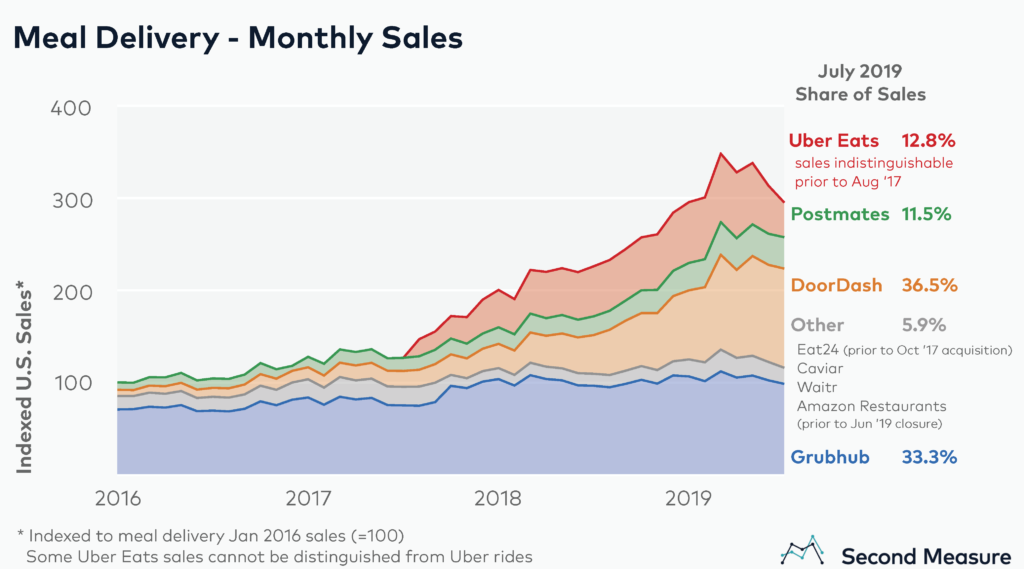 根据Second Measure最新数据,今年7月,DoorDash占据36.5%的市场,位列第一,而GrubHub紧跟其后拿下33.3%的市场。 从图上可以看出,全美国范围内增长速度最快的是Uber Eats,其市场份额增加到12.8%,位列第三。一直声称要IPO的Postmates暂时排在最后,享有11.5%的份额。