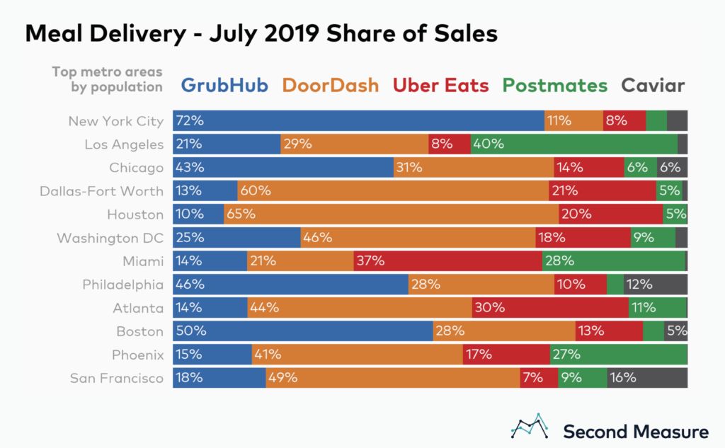 这四家公司也都有自己的“地盘”。 GrubHub在东北部如纽约、波士顿和费城最受欢迎,销售额最高的纽约达到72%,依旧保持着行业的龙头地位,但是与其他各家的差距正在逐渐减小。 DoorDash则是凭借其平台上大量可供选择的餐厅,在南部德州的达拉斯和休斯顿遥遥领先,均超过60%。Postmates占据了西部加利福尼亚州的洛杉矶40%的销售份额,Uber Eats则在东南部的迈阿密和亚特兰大一家独大。