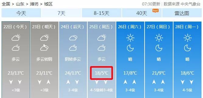 根据预报,未来五天,潍坊气温将坐上“过山车”。具体天气预报为:23日,天气多云,南风2~3级,最低气温11℃,最高气温23℃。