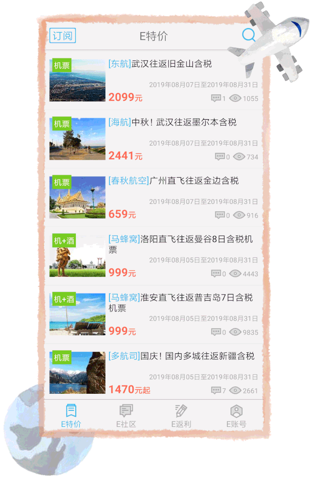 平时我是在E旅行的app上看特价信息。它们家的特价信息也很全,上至航空公司,下至订票平台,一览无遗~