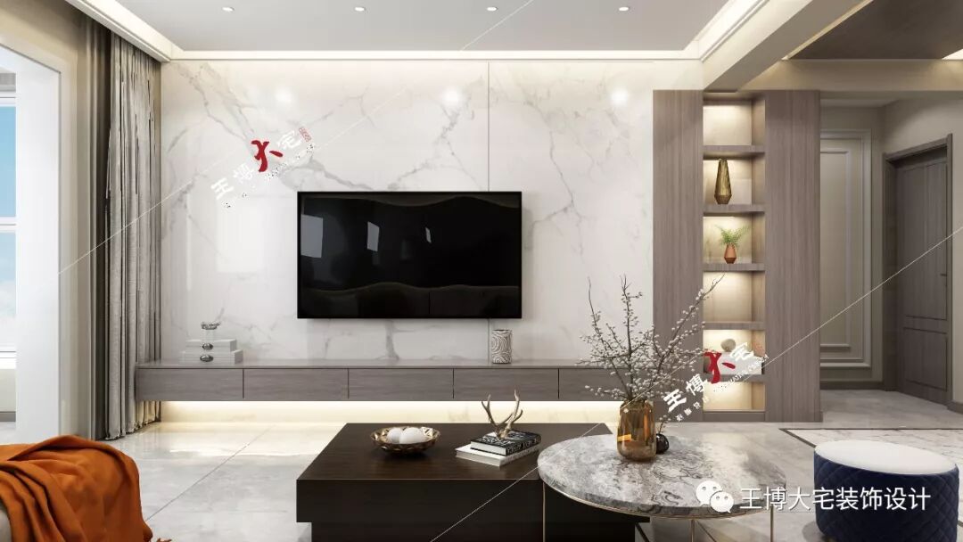 【主要材质】:爵士白大理石、意大利灰大理石、博洛尼亚瓷砖线条、露娜灰大地砖、大花白大地砖、咖色壁布、石膏造型线条