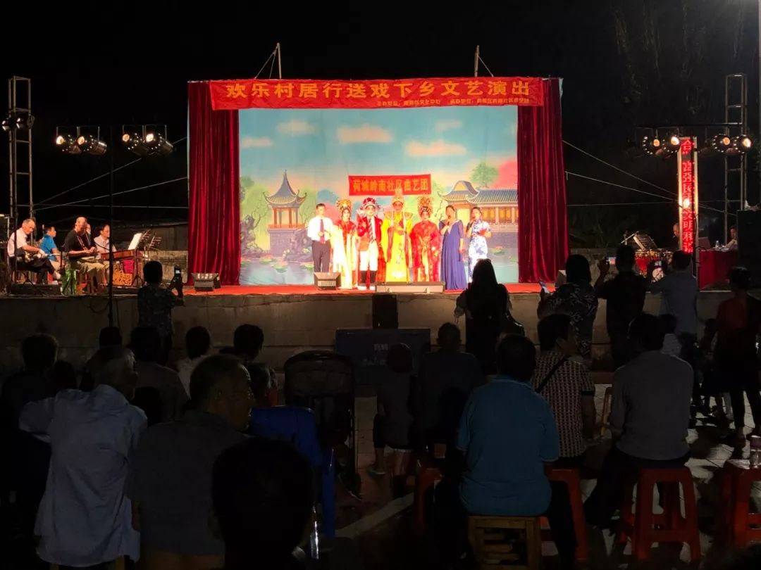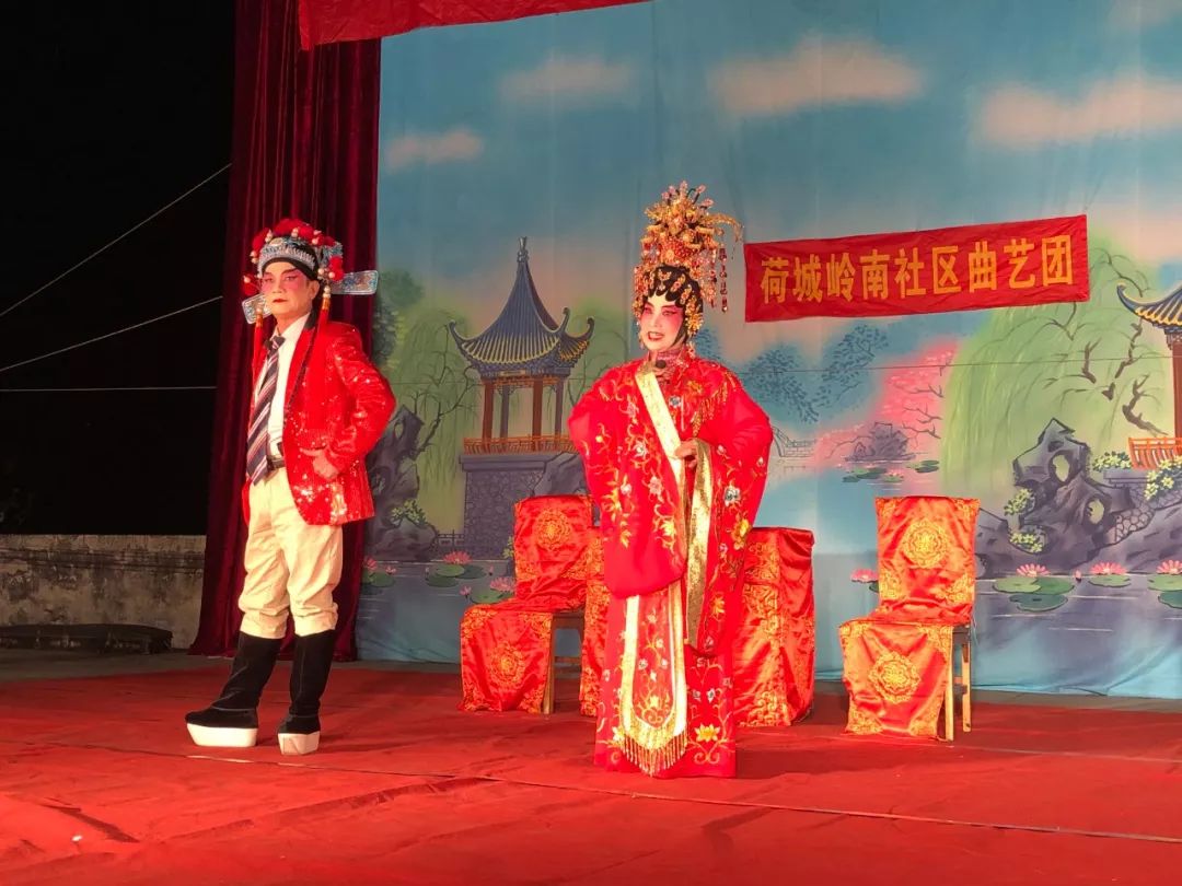 昨晚,在荷城街道阮埇村阮西文化广场,来自高明岭南社区曲艺团的表演者,以传统粤剧、折子戏、谐趣小品等形式,演绎大合唱、《新潮醉打金枝》、《小偷戏官》等节目,精彩的表演让观众大饱眼福。