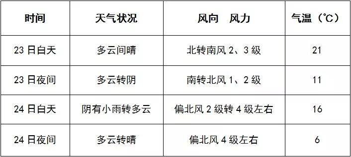 据预报,今天白天晴转多云,北转南风2、3级,最高气温21℃。受冷空气影响,预计24~26日气温下降明显,白天最高气温预计在16~14℃左右,夜间最低气温预计在7~2℃左右。周末是以晴为主的天气,但气温较低,如有出游计划,请务必注意添衣保暖。