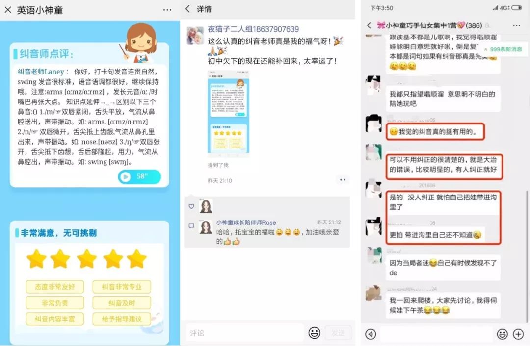读得不好也不怕,还有专业的真人纠音服务。英语八级的纠音老师,每天都会对宝宝的发音进行一对一进行点评、纠正。