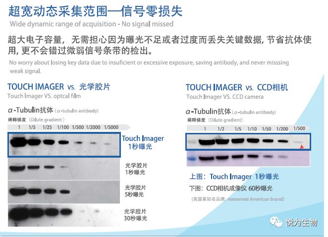 在目前主流WB拍照仪中,光信号经过相机镜头透射到CCD相机时,大量的光信号已消失。普通的暗房胶片直接接触膜,虽信号无损失,但耗时久,且工序繁琐。而Touch Imager则兼顾暗房胶片成像和数字成像的技术优势,采用超大感光芯片接触式采集化学发光信号,灵敏度高,源于超大电子容量设计,尤其是对微弱信号,且无需担心因为曝光不足或者曝光过度而丢失关键数据,从而提高了实验的成功率、重复性和定量精确。