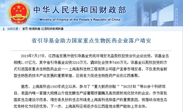 江西省政府官网、财政部官网的消息证实,今年7月,江西省发展升级引导基金已完成对靖安龙盈股权投资合伙企业出资,基金总规模为1.07亿元。该基金以股权投资的方式引进国家重点生物医药企业——上海高科生物工程有限公司落户靖安县。