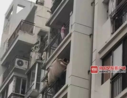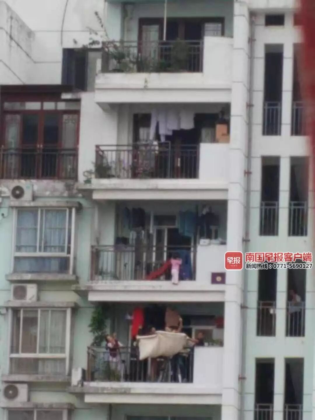 10月23日上午8:00许,在南宁市同和华彩小区B区4栋3单元,10楼的一个小女孩爬出窗外,情况危急,小区居民发现后纷纷赶来救援。有人在楼下撑起被子,有人在9楼撑起被子。家长及时赶回,剪断隐形防盗网,把孩子救了下来。