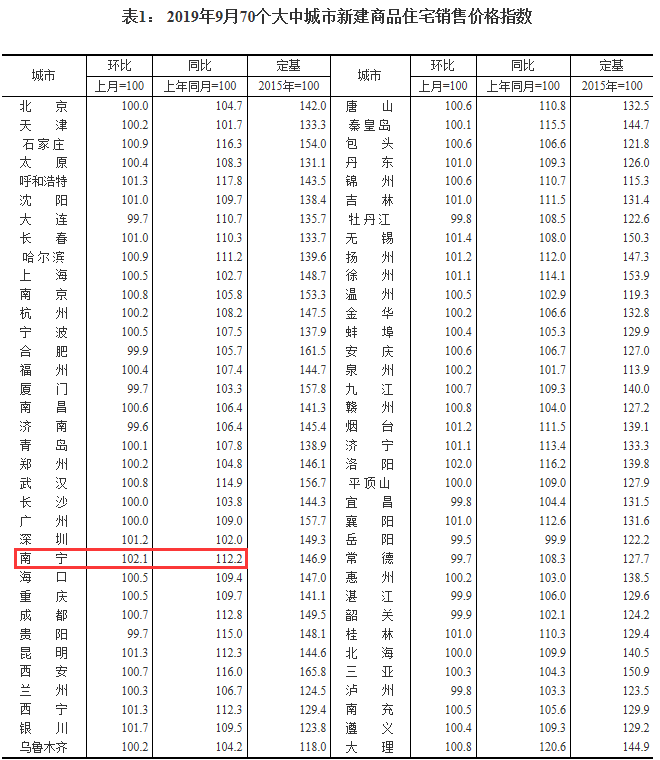 9月全国70城市房价涨幅,图片来源:统计局官网在房价上涨的城市中,南宁和唐山以2.1%、1.8%的涨幅在新建住宅和二手房市场各领风骚。其中,南宁新建商品住宅环比上涨2.1%,这也是继8月之后南宁第二次居全国房价涨幅之首!