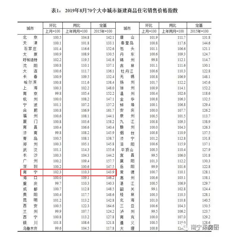 8月全国70城市房价涨幅,图片来源:统计局官网按照目前南宁房价不太公开透明,有大量团购费等外收的现状,70城房价环比涨跌幅度颇有失真,不太能真实反映南宁房价的确切走向。