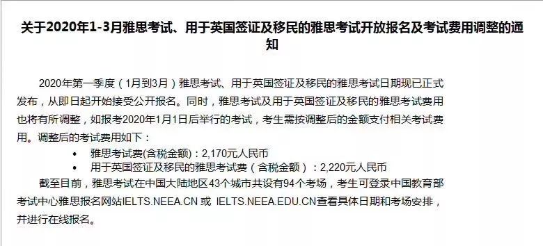 另外,雅思官网发布2020年1-3雅思考试安排,含雅思考试和用于英国签证及移民的雅思考试,从即日起开始接受公开报名,关于2020年1-3月雅思考试、用于英国签证及移民的雅思考试开放报名及考试费用调整的通知。