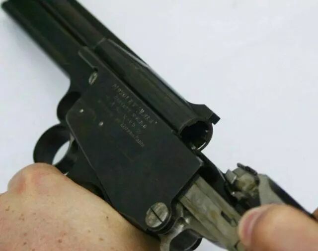 Mars手枪,靠延长枪管的运动距离来多少缓解一点几乎要让手腕脱臼的恐怖后坐力。再配上枪机回转闭锁,总算可以正常生产了,而特长的枪管除了提高子弹初速,对降低枪口焰也算有点用处。不过这把手枪操作起来十分复杂,而且弹壳会直接弹到开枪者的脸上。