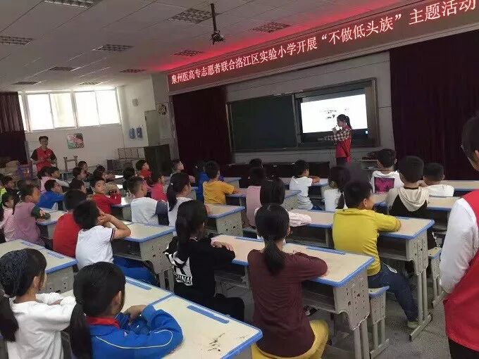 近年来,手机占领了我们的生活,导致学生近视率越来越高,为了呼吁学生正确使用手机,10月23日下午,泉州医学高等专科学校青年志愿者协会为洛江区实验小学的孩子打了一记特殊的“预防针”——“不做低头族”。