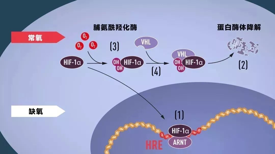 2019年诺贝尔生理医学奖颁给了三位科学家以表彰他们在揭示细胞感知和适应氧气供应机制所做的贡献。研究发现正常氧气条件下,细胞内的低氧诱导因子(HIF)会被蛋白酶体降解,低氧环境下,HIF能促进缺氧相关基因的表达从而使细胞适应低氧环境。该研究有望为诸多疾病的治疗提供希望。请图分析回答: