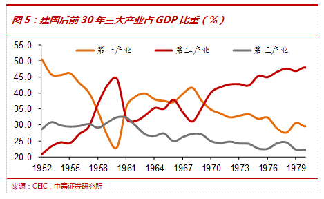 但不能仅仅用GDP去简单评判前30年的增长,毕竟当时所处的内外政治环境不同,寻求发展之前必须抗住生存的压力。此外,建国初期集中力量对工业经济的大量投入,尤其是对重工业的大力支持,不仅为之后几十年的和平发展提供了强大的实力保障,也为后续工业化的推进打下了坚实基础(图5)。用小平同志的话来总结:“我们做了很多的事情,成绩不少,虽然也犯了一些错误,但不是一团漆黑”。