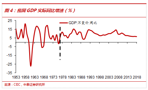 1978-2018年,我国经济年化增速高达9.5%,与前30年的大幅波动相比,最近40年经济要平稳很多。这与40年间持续的改革开放政策、解放和发展生产力有着不可分割的联系。