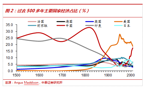 单纯从科技发展对经济影响的角度看,工业革命以后,技术进步加快,使得人口对经济增长的作用在减弱(图3)。尽管英国在16世纪末就打败了西班牙,在西方国家中开始崛起,但英国经济真正的大幅腾飞是在工业革命以后。第二次工业革命中,美国的经济实力也开始崛起,在19世纪末逐渐超过了英国。但真正让美国的影响力拓展到全球的是两次世界大战,欧洲主要强国在战争中受损严重,美国借机快速发展壮大,成为全球第一强国。