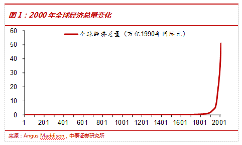 所以,过去2000多年的全球经济增长,可以说主要是由工业革命后的最后200年贡献的(图1)。