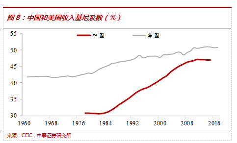 从外部环境来看,全球老龄化、贫富差距不断加深,全球化进程面临信任危机,形势错综复杂。全球65岁以上老年人口占比从2002年就已经突破7%,也就是说进入老龄化社会,截至2018年末,这一比例已经接近9%。与此同时,市场化尽管可以提升效率,但也会伴随着个体之间的分化。当前全球主要经济体贫富分化严重,内部矛盾突出。比如美国对华发起的贸易问题,很大程度上是美国自身贫富分化问题的体现和转移,即内部矛盾外部化(图8)。WTO主导下的全球化进程也遇到挑战,技术竞争的同时,也透露出彼此之间信任危机。随着中国的崛起,外部带有敌意的竞争压力也会加大,给中国经济发展制造各种障碍。
