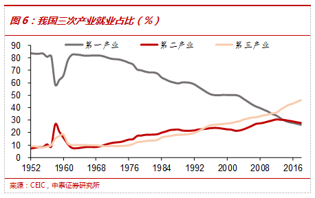 所以,尽管我国有人口红利的优势,但是改革开放前仍然有接近80%的人口集中生活在农村地区,从事着低效率的农业生产活动;而改革开放以后,随着生产力的解放,民营企业的兴起,我国第一产业就业人口占比大幅下降,农村剩余劳动力大量转移到城市,城镇化和工业化快速推进,劳动力的成本优势才得以充分发挥(图6)。
