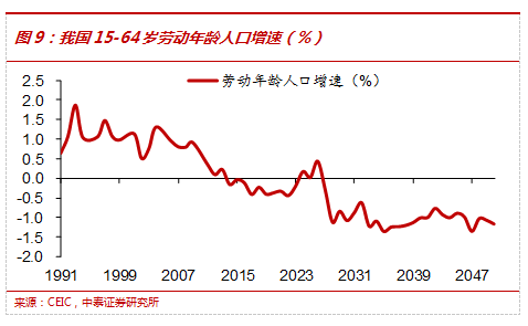 如今,我国劳动力成本优势逐渐消退,房地产泡沫风险较大,政策已经很难再一味地刺激,而是需要在稳增长和防风险之间平衡。我国15-64岁的劳动年龄人口数量从2012年以后就在不断下行,过去已经连续7年负增长(图9)。而人口仍是经济增长中非常重要的变量,过去十年我国潜在经济增速在不断下行。