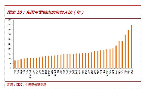 采用Leslie模型做预测,会发现未来我国人口形势恐怕还将变得更为严峻,这就决定了我国经济增速依然有下行压力。而当前居民、企业债务负担都比较重,各线城市房价均已飙升至高位,尤其是小城市房地产流动性较差,面临的风险更大(图10)。也就是说,当前进一步刺激房地产来拉动经济的空间相对有限,经济的系统性风险较高。在经济潜在增速下行中,政策必须在稳增长和防风险之间进行权衡。