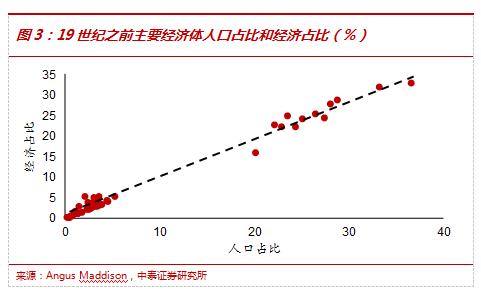 从2000年历史的维度来看,我国经济经历了从领先到落后到再崛起的过程。在19世纪之前,我国和印度是全球经济的“领头羊”,经济总量占比都在20%以上。但在当时的生产方式下,人口数量是决定经济体量非常重要的变量,例如当时中国和印度的人口占比也都在全球的20%以上。全球来看也是如此,人口多的国家,经济体量大;人口少的国家,经济体量较小。