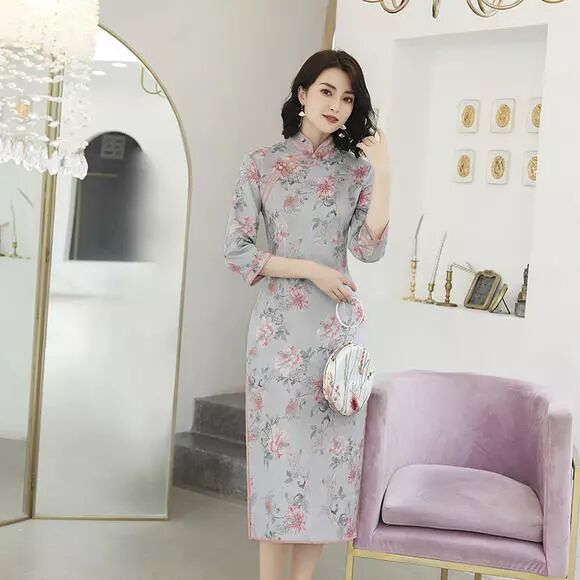 复古七分袖,南韩丝旗袍连衣裙WXG-19095