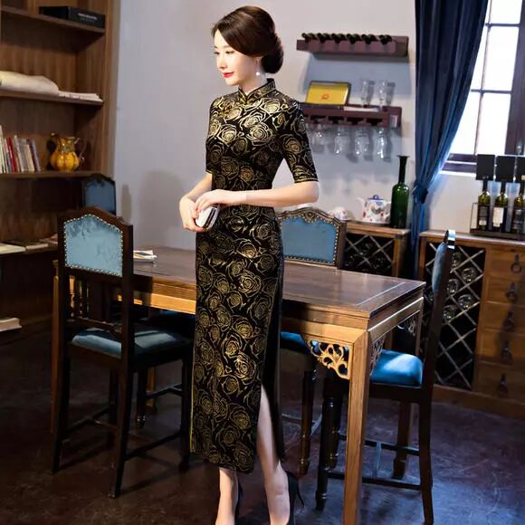 改良修身,中袖烫金丝绒旗袍FRY-9920
