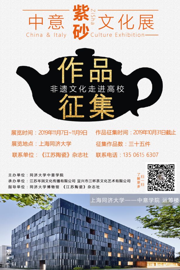 主办单位:同济大学中意学院指导单位:同济大学博物馆、《江苏陶瓷》杂志社承办单位:江苏岑润文化传播有限公司协办单位:宜兴市三杯茶文化艺术有限公司