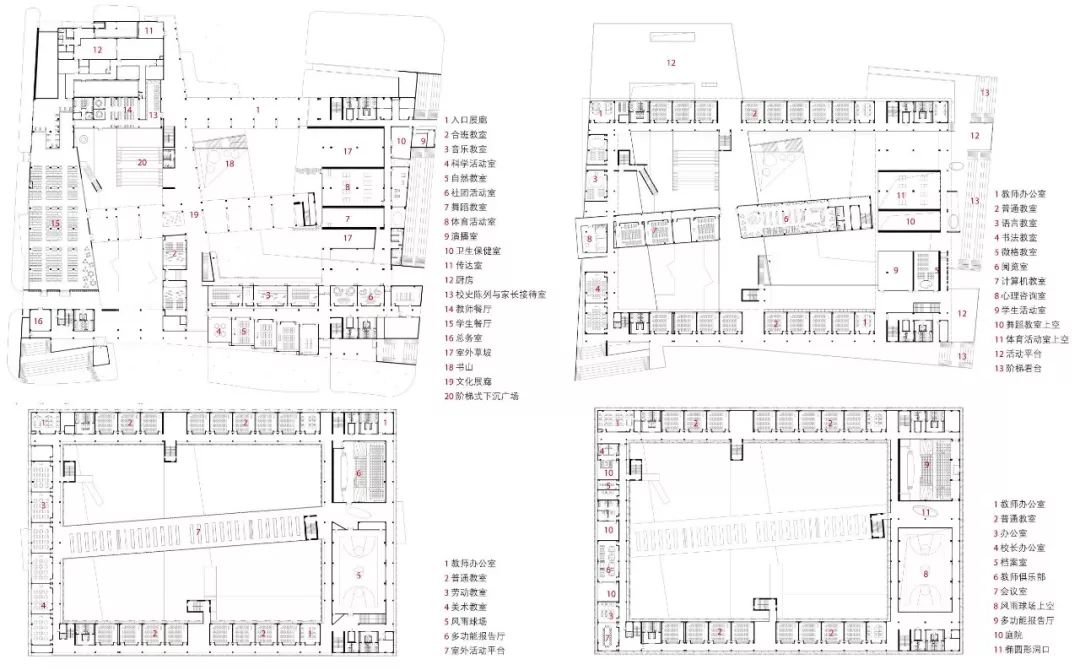 鹤和小学显然采用了垂直向功能叠合的空间布局,但是从项目的场地条件来看,这并非是针对用地紧张的被动设计,而是基于空间公共性与教育开放性思考的主动选择。为了获得最大化的户外活动场地,并增强使用中的交互性,设计将常规的教学组团都移至二层以上,而将音乐、舞蹈、自然、科学等教室以及社团活动、体育活动等素质教育为主的公共教室都优先布置在学生使用最为频繁的首层空间,通过风雨廊连接,并利用底层架空空间来发展户外教学,提升外部空间的公共性。其更深层的意义在于,教学组团的立体叠合有利于促进首层空间的高效使用与混合活力,相比平面松散型的肌理校园,更能体现教育空间的凝聚力与互动性。而且,这些公共教室都是向各年级师生开放的,各种人群与功能在此交织、交往,差异化的观点和体验在此试验、产生并碰撞,体现了开放性教育的特点。另外,将师生餐厅布置在首层西侧,开敞明亮,视野开阔,同时也是多功能活动空间,集体就餐行为由此转化为校园内日常的互动交往。运动场布置在基地东侧,既可以降低东侧道路交通噪音对教学区的影响,也有助于满足非教学时段对社会开放的使用要求。而从学生使用的角度来看,这一设置则提供了与教学区无缝连接且没有西晒阳光的宽大看台区,从而“让运动成为一种表演”,实现了“看”与“被看”的双向需求[11]。建筑二层为过渡层,总体上呈“日”字形布局,设置了次一级公共性的专用教室,如书法、语言、微格与计算机教室和阅览室及心理咨询室等,并利用南北两条长边布置了普通教学空间。三至四层则是规整的四合院布局,设置了公共性较弱的常规普通教室、专用教室和行政办公等,空间设计紧凑而高效,以保证尽量多的建筑面积可以置换到底部的“非教学空间”。至此,建筑的空间性格自下而上呈现为活跃到安静、多元到单一、宽松到紧凑的过渡与转变,整体校园空间则实现了从均质平铺的“厂房式建筑”到垂直生长的“教育生态系统”的进化与转型,继而获得了一种“社会性”。