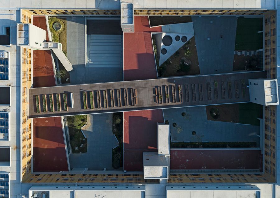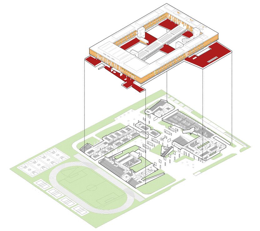由于教学空间的叠层布置与楼层平面的错动设计,产生了不同标高与形态的公共活动基面,既为同层使用的学生提供了邻近的户外活动场地,也为不同楼层的学生创造了视线互望的机会。特别是从三、四层的环绕廊道可以俯瞰整个中心庭院,产生类似于广场空间的边缘效应,同学们可以居高临下地观察各个院落的活动内容,也可以发现某个小伙伴或是老师的位置,从而吸引他们的注意力并唤起体验的欲望,促成以不同方式来参与校园活动。不同基面之间的路径联系也是设计的一个亮点。整个建筑中没有明显的主楼梯,而是沿着合院的四边各设置一个独立楼梯间,其中有三个楼梯可以通过二层公共平台的转化到达地面,一个是宽松自由的斜坡大台阶,一个是便捷高效的直跑楼梯,还有一个则是幽闭神秘的矩形斜盒子,同学们可以依据自己的喜好或心情选择不同的上下楼路径,将被动而单调的交通行为转换为主动而有趣的路径探索。值得一提的是,校长还专门测试过同学们对校园内日常行动路径的选择,发现他们并不总是优先选择距离更近或者更平缓的通行路径,而是更偏爱复杂多变和活动参与度高的空间环境。